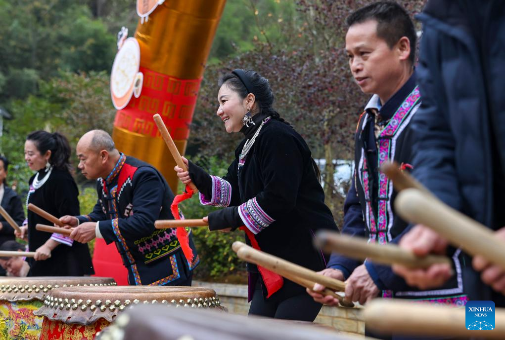 BEIJING, 14 enero, 2026 (Xinhua) -- Imagen del 21 de diciembre de 2025 de aldeanos tocando tambores para celebrar el Solsticio de Invierno, en la aldea de Dawan, en la ciudad de Tongren de provincia de Guizhou, en el suroeste de China. China entra en su estación más fría en el undécimo mes del calendario lunar chino. La urbanización y la agricultura moderna han debilitado el impacto de los términos solares en la vida cotidiana, pero los hábitos culturales y alimenticios se han transmitido de generación en generación. (Xinhua/Hu Panxue)