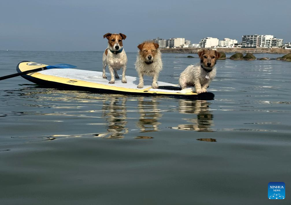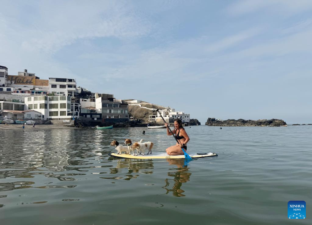 LIMA, 14 enero, 2026 (Xinhua) -- Imagen tomada con un teléfono móvil el 14 de enero de 2026 de una mujer paseando con perros en una tabla de surf de remo en una playa de San Bartolo, en Lima, Perú. (Xinhua/Mariana Bazo)