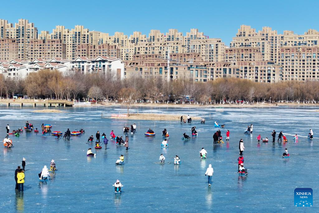 BEIJING, 15 enero, 2026 (Xinhua) -- Imagen tomada con un dron el 11 de enero de 2026 de personas divirtiéndose en un lago congelado en el parque nacional de humedales del lago Baohu, en Yinchuan, en la región autónoma de la etnia hui de Ningxia, en el noroeste de China. (Xinhua/Yuan Hongyan)