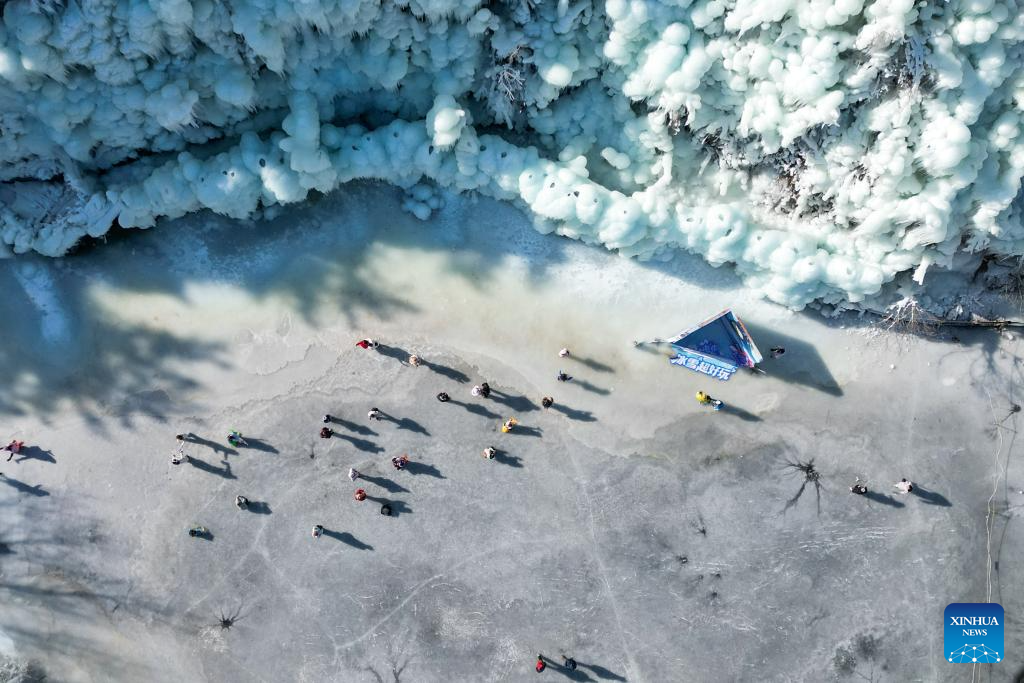 BEIJING, 15 enero, 2026 (Xinhua) -- Vista aérea tomada con un dron el 13 de enero de 2026 de personas divirtiéndose en un lago congelado en el punto escénico de la montaña Jiuru, en la ciudad de Jinan, en la provincia de Shandong, en el este de China. (Xinhua/Hao Xincheng)