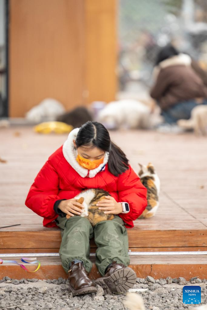 CHONGQING, 15 enero, 2026 (Xinhua) -- Imagen del 14 de enero de 2026 de una visitante interactuando con un gato en un parque temático de gatos, en el distrito de Nan'an, en Chongqing, en el suroeste de China. Desde 2025, un terreno baldío a lo largo del río Yangtsé, en el distrito de Nan'an de Chongqing, se ha transformado en un parque temático de gatos. Con una superficie de 30.000 metros cuadrados, el parque sirve como refugio para gatos callejeros abandonados o heridos. (Xinhua/Huang Wei)