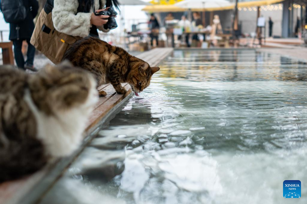 CHONGQING, 15 enero, 2026 (Xinhua) -- Imagen del 14 de enero de 2026 de un gato tomando agua de una corriente de agua en un parque temático de gatos, en el distrito de Nan'an, en Chongqing, en el suroeste de China. Desde 2025, un terreno baldío a lo largo del río Yangtsé, en el distrito de Nan'an de Chongqing, se ha transformado en un parque temático de gatos. Con una superficie de 30.000 metros cuadrados, el parque sirve como refugio para gatos callejeros abandonados o heridos. (Xinhua/Huang Wei)