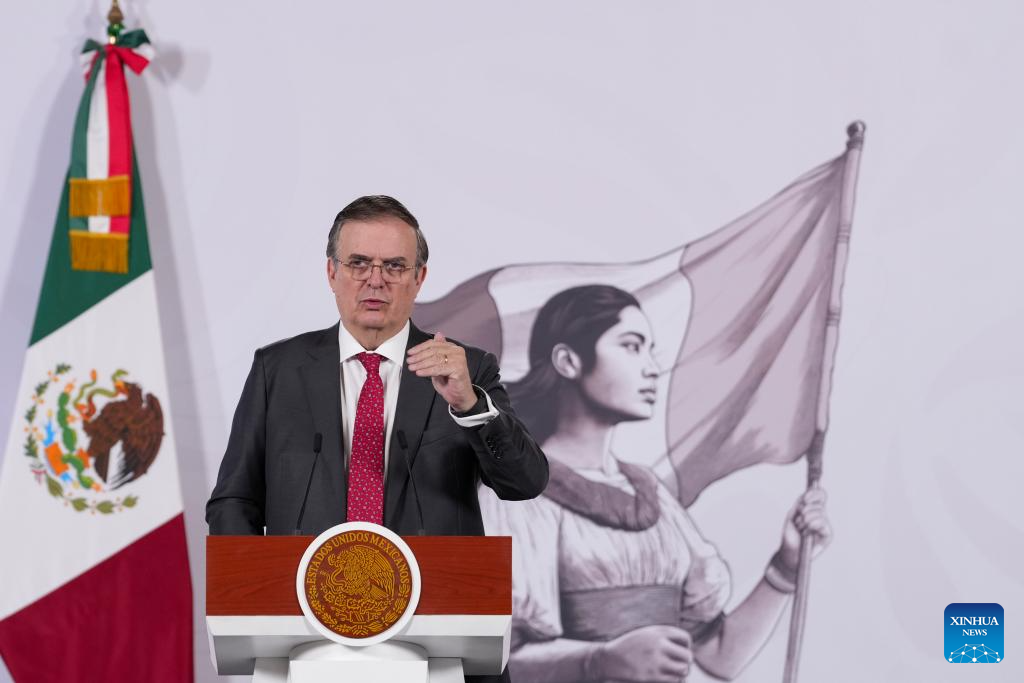 CIUDAD DE MEXICO, 15 enero, 2026 (Xinhua) -- Imagen proveída por la Presidencia de México del secretario de Economía mexicano, Marcelo Ebrard, hablando durante la conferencia de prensa matutina de la presidenta mexicana, Claudia Sheinbaum, en Palacio Nacional, en la Ciudad de México, capital de México, el 15 de enero de 2026. La prioridad mexicana en la renegociación del Tratado entre México, Estados Unidos y Canadá (T-MEC) de libre comercio que se efectuará a mediados de año es garantizar su continuidad y su fortalecimiento debido a la relevancia que tiene para el desarrollo económico de la región, afirmó el jueves Ebrard. (Xinhua/Presidencia de México)