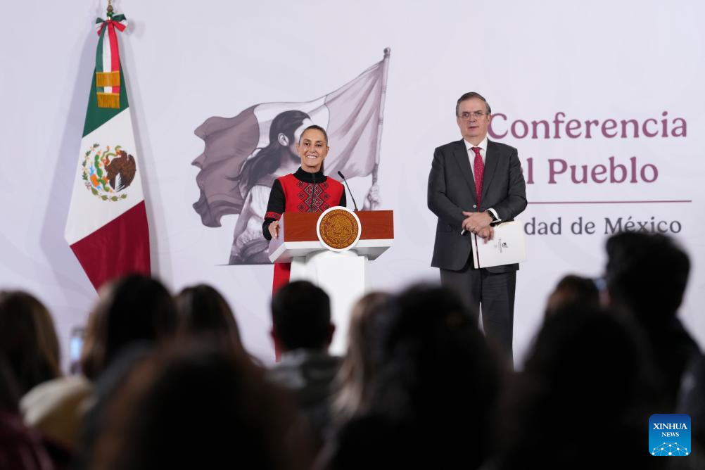 CIUDAD DE MEXICO, 15 enero, 2026 (Xinhua) -- Imagen proveída por la Presidencia de México de la presidenta mexicana, Claudia Sheinbaum (i-atrás), hablando junto al secretario de Economía mexicano, Marcelo Ebrard (d-atrás), durante su conferencia de prensa matutina, en Palacio Nacional, en la Ciudad de México, capital de México, el 15 de enero de 2026. La prioridad mexicana en la renegociación del Tratado entre México, Estados Unidos y Canadá (T-MEC) de libre comercio que se efectuará a mediados de año es garantizar su continuidad y su fortalecimiento debido a la relevancia que tiene para el desarrollo económico de la región, afirmó el jueves Ebrard. (Xinhua/Presidencia de México)