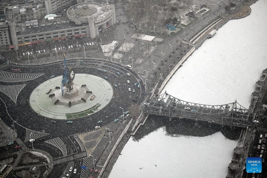 TIANJIN, 17 enero, 2026 (Xinhua) -- Imagen del 17 de enero de 2026 de una vista del río Haihe en medio de una nevada, en Tianjin, en el norte de China. Tianjin fue testigo de su primera nevada de 2026 el sábado. (Xinhua/Li Ran)