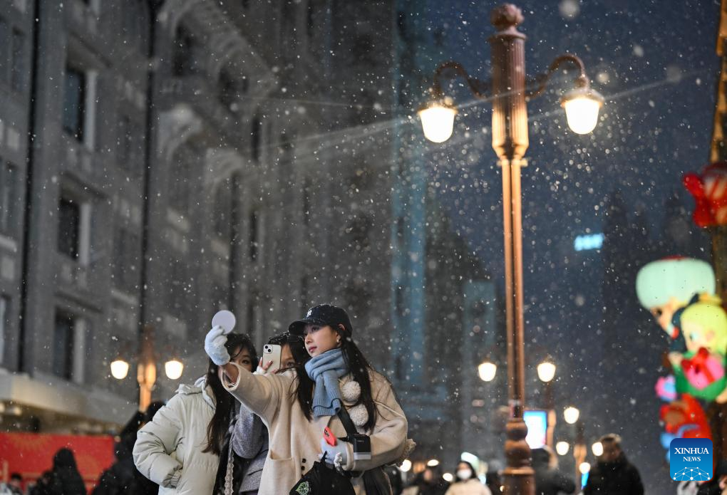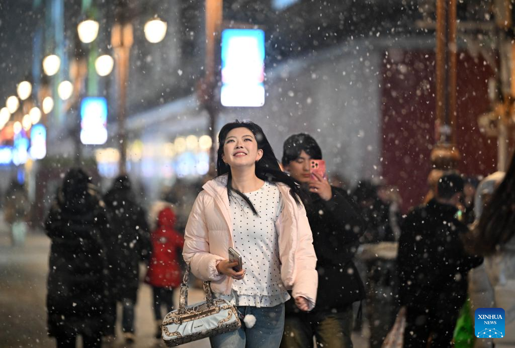 TIANJIN, 17 enero, 2026 (Xinhua) -- Personas toman fotografías en medio de una nevada en una calle, en el distrito de Heping de Tianjin, en el norte de China, el 17 de enero de 2026. Tianjin fue testigo de su primera nevada de 2026 el sábado. (Xinhua/Zhao Zishuo)