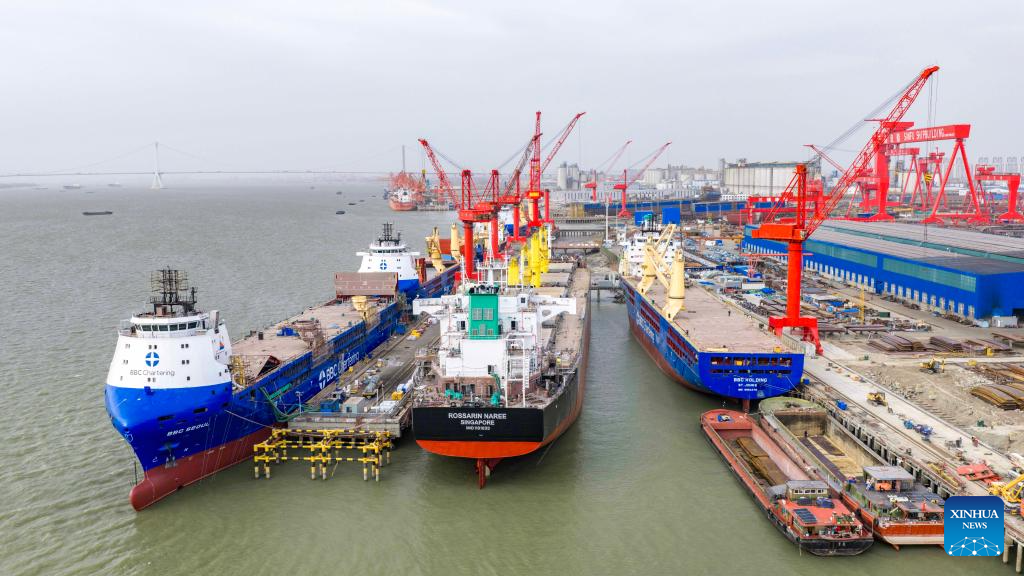 BEIJING, 19 enero, 2026 (Xinhua) -- Imagen tomada con un dron el 11 de enero de 2026 de embarcaciones en construcción en una empresa de construcción naval en Taizhou, en la provincia de Jiangsu, en el este de China. El producto interno bruto (PIB) de China creció un 5 por ciento interanual en 2025, cumpliendo con el objetivo anual de alrededor del 5 por ciento, según datos oficiales publicados el lunes. El PIB de China alcanzó un récord de 140,1879 billones de yuanes (unos 20,01 billones de dólares) el año pasado, resaltó el Buró Nacional de Estadísticas. (Xinhua/Zhou Shegen)