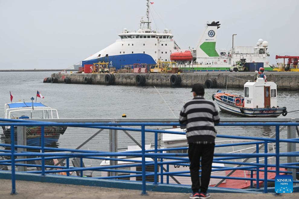 Imagen del 19 de enero de 2026 del buque chino "Tan Suo Yi Hao" en el Puerto de Valparaíso, en la ciudad de Valparaíso, Chile. Con la misión de investigar por primera vez con "exploradores directos" las profundidades de la Fosa de Atacama en las costas chilenas, cuya vida marina y actividad geológica tiene un valor científico incalculable, arrancó la misión del buque chino "Tan Suo Yi Hao", cuyo sumergible tripulado "Fendouzhe" se adentrará a las profundidades en este confín del mundo. (Xinhua/Jorge Villegas)