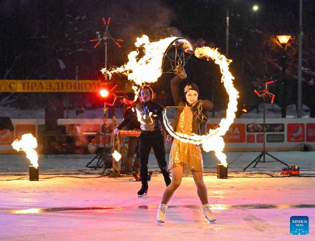MOSCU, 25 enero, 2026 (Xinhua) -- Imagen del 24 de enero de 2026 de artistas realizando una presentación durante un espectáculo llamado "Hielo en llamas" en una pista de hielo de un parque, en Moscú, Rusia. (Xinhua/Hao Jianwei)