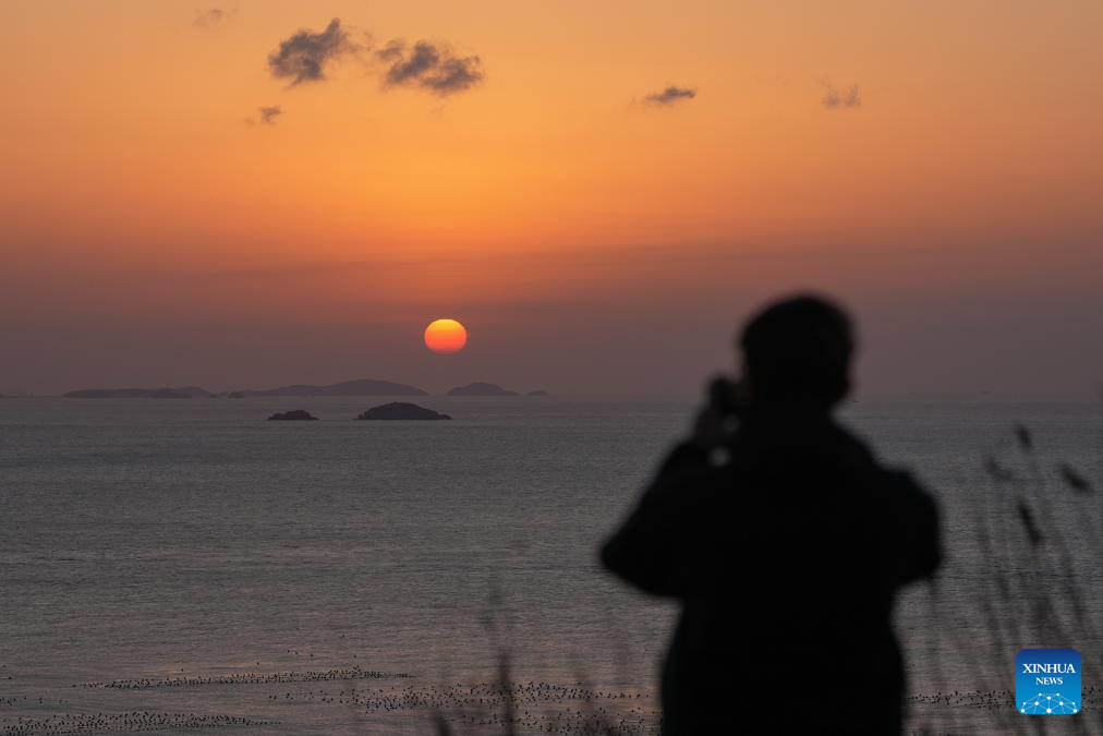 ZHOUSHAN, 28 enero, 2026 (Xinhua) -- Un visitante toma fotografías de una vista del atardecer en la isla Huaniao, en el distrito de Shengsi, en la ciudad de Zhoushan de la provincia de Zhejiang, en el este de China, el 28 de enero de 2026. (Xinhua/Huang Zongzhi)