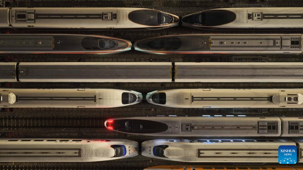 GUANGZHOU, 1 febrero, 2026 (Xinhua) -- Imagen del 1 de febrero de 2026 de trenes de alta velocidad en un depósito de mantenimiento, en Guangzhou, en la provincia de Guangdong, en el sur de China. Los trenes de alta velocidad en toda China se están preparando para la próxima temporada alta de viajes por el Festival de la Primavera, también conocido como chunyun, que comienza el 2 de febrero de 2026. Cada año, a lo largo de este período, millones de personas que trabajan, estudian o viven en lugares distintos a aquellos donde se encuentran sus hogares de origen regresan a estos para la festividad, que es la celebración tradicional más importante de China y se considera la mayor migración humana anual del mundo. (Xinhua/Deng Hua)
