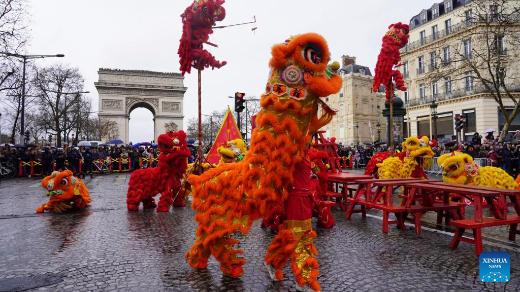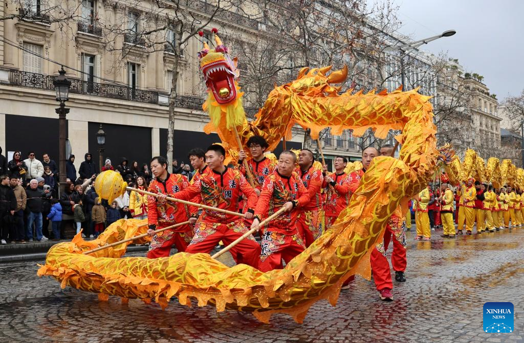 PARIS, 2 febrero, 2026 (Xinhua) -- Imagen del 1 de febrero de 2026 de personas realizando una danza del dragón durante un desfile para celebrar el próximo Año Nuevo chino en la avenida de los Campos Elíseos, en París, Francia. (Xinhua/Zhang Baihui)