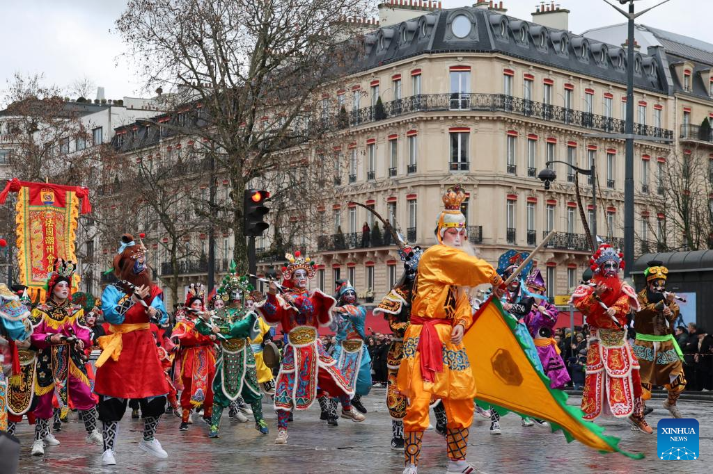 PARIS, 2 febrero, 2026 (Xinhua) -- Imagen del 1 de febrero de 2026 de artistas interpretando una danza Yingge durante un desfile para celebrar el próximo Año Nuevo chino en la avenida de los Campos Elíseos, en París, Francia. (Xinhua/Zhang Baihui)