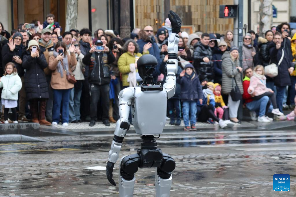 PARIS, 2 febrero, 2026 (Xinhua) -- Imagen del 1 de febrero de 2026 de un robot humanoide, inventado por una empresa china y suministrado por la empresa tecnológica francesa INNOV8 Group, saludando durante un desfile para celebrar el próximo Año Nuevo chino en la avenida de los Campos Elíseos, en París, Francia. (Xinhua/Zhang Baihui)