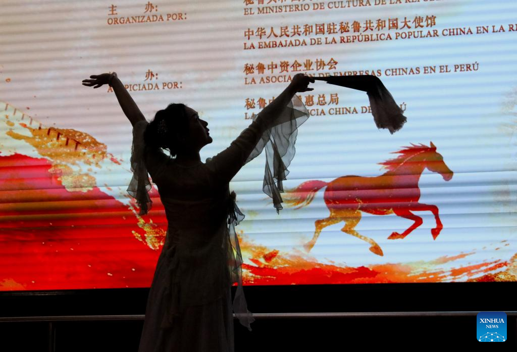 (260202) -- LIMA, 2 febrero, 2026 (Xinhua) -- Imagen del 1 de febrero de 2026 de una bailarina realizando una presentación de una danza típica china durante la celebración del Día de la Confraternidad Peruano-China y la Feria Tradicional del Año Nuevo chino en el Ministerio de Cultura, en Lima, Perú. Peruanos vivieron el domingo un ambiente colorido y festivo durante la celebración del Día de la Confraternidad Peruano-China y la Feria Tradicional del Año Nuevo chino, realizada en las inmediaciones del Ministerio de Cultura en la ciudad de Lima. (Xinhua/Mariana Bazo)