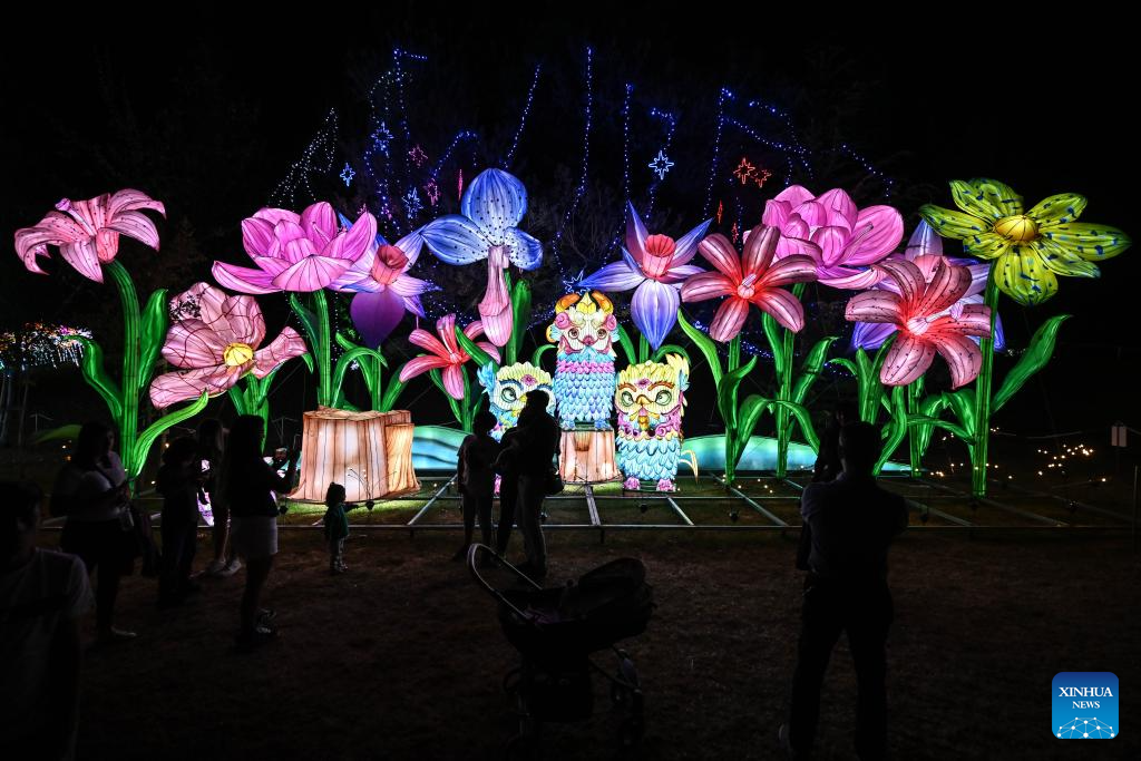 SANTIAGO, 6 febrero, 2026 (Xinhua) -- Imagen del 5 de febrero de 2026 de personas visitando la inauguración de la feria de luces chinas, Tianfu Festival, en el Parque Padre Hurtado de la Reina, en Santiago, capital de Chile. Los pandas gigantes de la provincia china de Sichuan, el Buda de cuatro caras del monte Emei y el estilo de pintura tradicional verde y azul, Qinglü Shanshui, son algunos de los atractivos de gran tamaño que iluminan los atardeceres de Santiago de Chile, en el marco de la feria de luces chinas, Tianfu Festival, inaugurada ayer jueves en la previa del Año Nuevo chino. (Xinhua/Jorge Villegas)