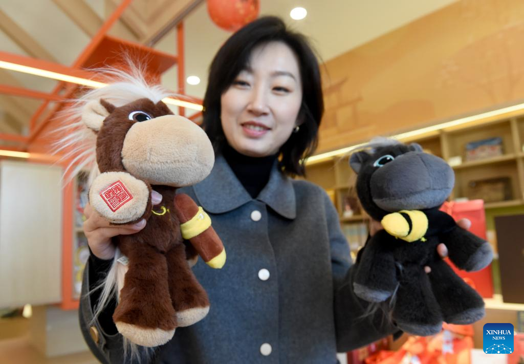 BEIJING, 7 febrero, 2026 (Xinhua) -- Una trabajadora muestra los juguetes de peluche con forma de cabeza de caballo recién lanzados durante una fiesta de jardín de Fiesta de la Primavera en el Antiguo Palacio de Verano (Yuanmingyuan), en Beijing, capital de China, el 7 de febrero de 2026. La fiesta de jardín de Fiesta de la Primavera de cuatro días de duración fue inaugurada aquí el sábado. (Xinhua/Luo Xiaoguang)