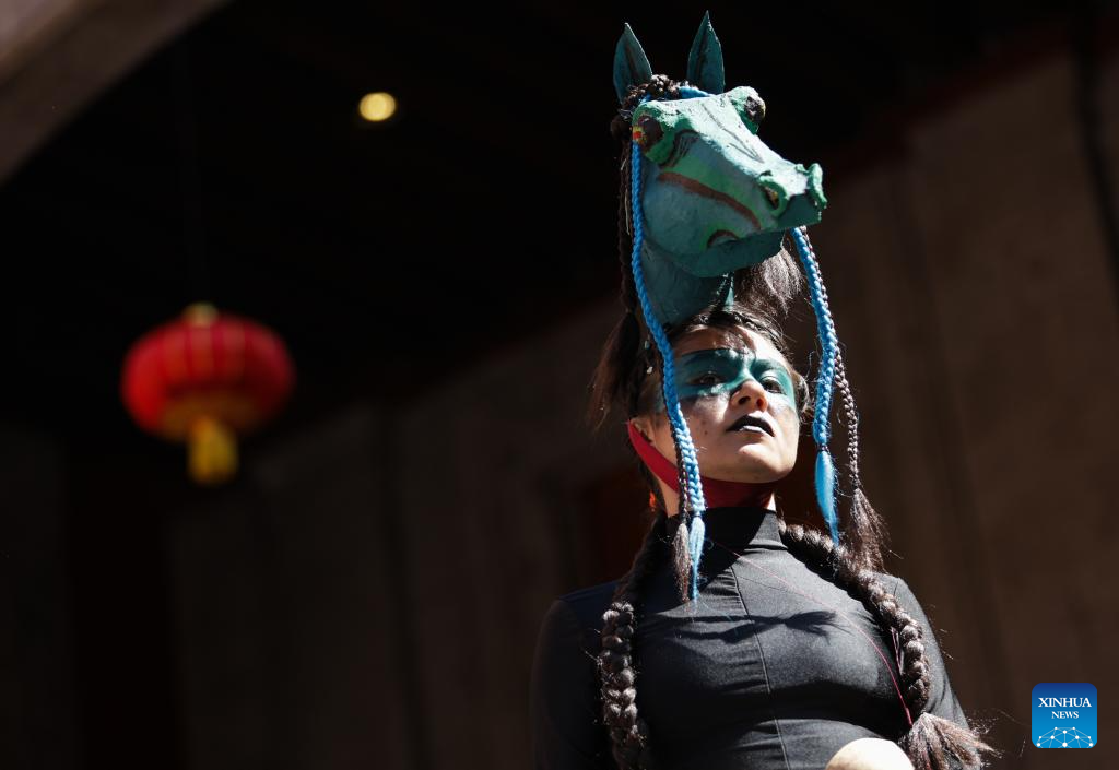 Imagen del 7 de febrero de 2026 de una participante presentando su disfraz durante el 8 Concurso de Disfraces "Año del Caballo", en el marco de la celebración del Año Nuevo chino, en la Ciudad de México, capital de México. Con un ambiente festivo, familiar y lleno de color, más de 15.000 personas se congregaron el sábado en el corazón de la Ciudad de México para participar en las celebraciones del Año Nuevo chino en el país latinoamericano, que incluyeron un vistoso desfile de leones y dragones, así como un concurrido concurso de disfraces inspirado en los animales del zodiaco. (Xinhua/Francisco Cañedo)
