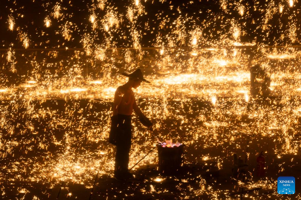 SHANGHAI, 8 febrero, 2026 (Xinhua) -- Un espectáculo de fuegos artificiales de hierro fundido se lleva a cabo junto al río Huangpu, en Pudong, en Shanghai, en el este de China, el 8 de febrero de 2026. (Xinhua/Wang Xiang)