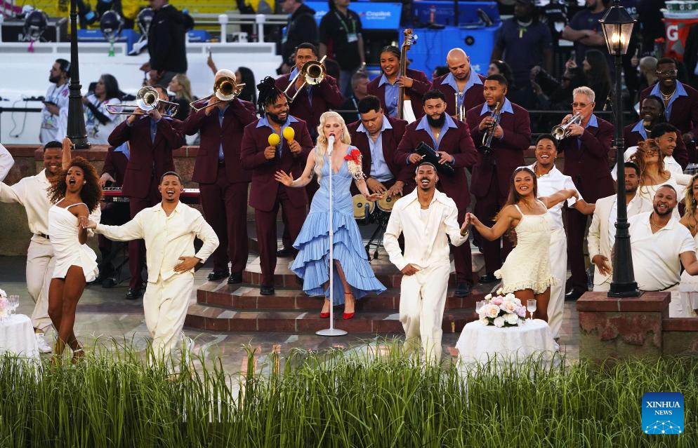 SANTA CLARA, 9 febrero, 2026 (Xinhua) -- Imagen del 8 de febrero de 2026 de la cantante Lady Gaga (c) realizando una presentación durante el Super Bowl LX de la NFL, entre Seattle Seahawks y New England Patriots, en Santa Clara, Estados Unidos. (Xinhua/Wu Xiaoling)