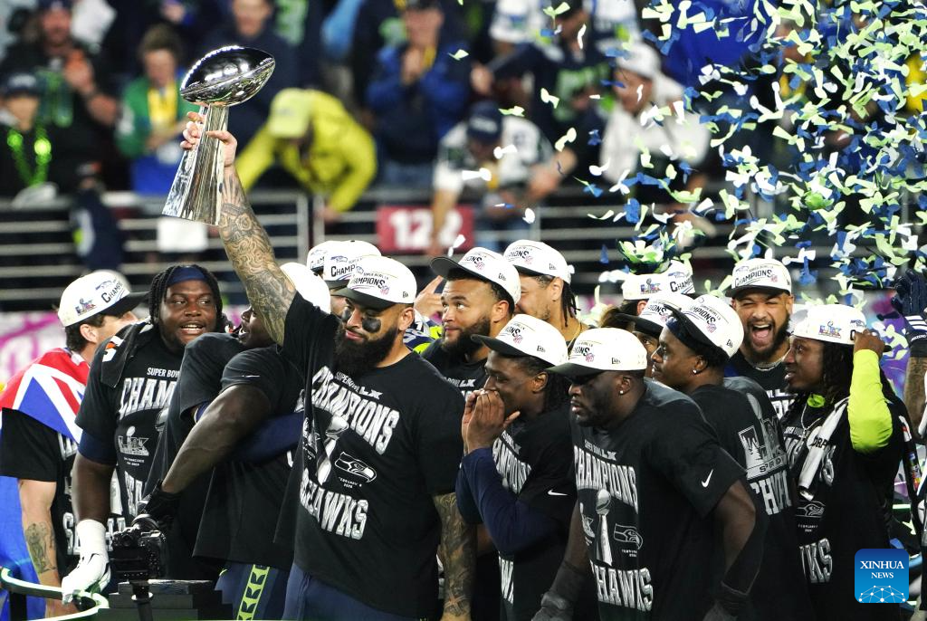 SANTA CLARA, 9 febrero, 2026 (Xinhua) -- Imagen del 8 de febrero de 2026 de jugadores de Seattle Seahawks festejando durante la ceremonia de premiación después de ganar el Super Bowl LX de la NFL, entre Seattle Seahawks y New England Patriots, en Santa Clara, Estados Unidos. (Xinhua/Wu Xiaoling)