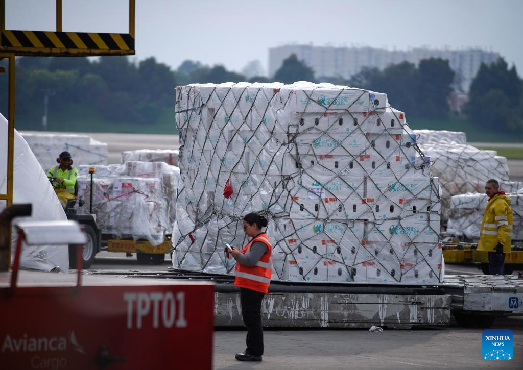BOGOTA, 11 febrero, 2026 (Xinhua) -- Imagen del 10 de febrero de 2026 de trabajadores realizando labores de carga y transporte de flores en la terminal de carga del Aeropuerto Internacional El Dorado, en Bogotá, capital de Colombia. El gremio floricultor de Colombia ha reportado como exitosas sus operaciones de exportación durante la temporada de San Valentín, a pesar del incremento de los aranceles para ese producto colombiano, ordenado por el Gobierno de Estados Unidos en abril del pasado año.(Xinhua/Andrés Moreno)