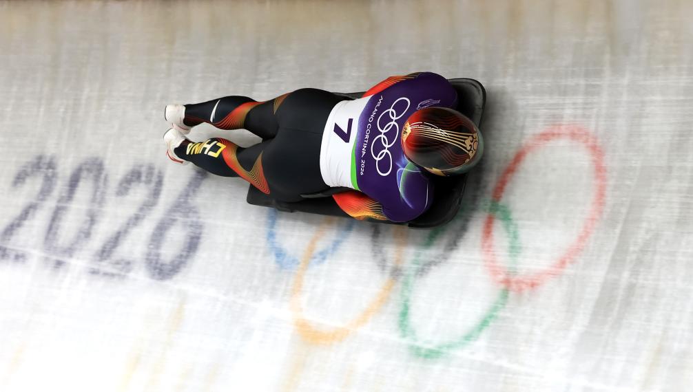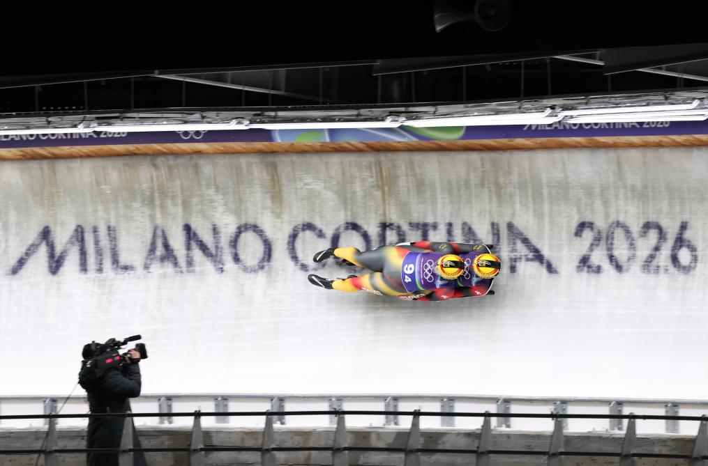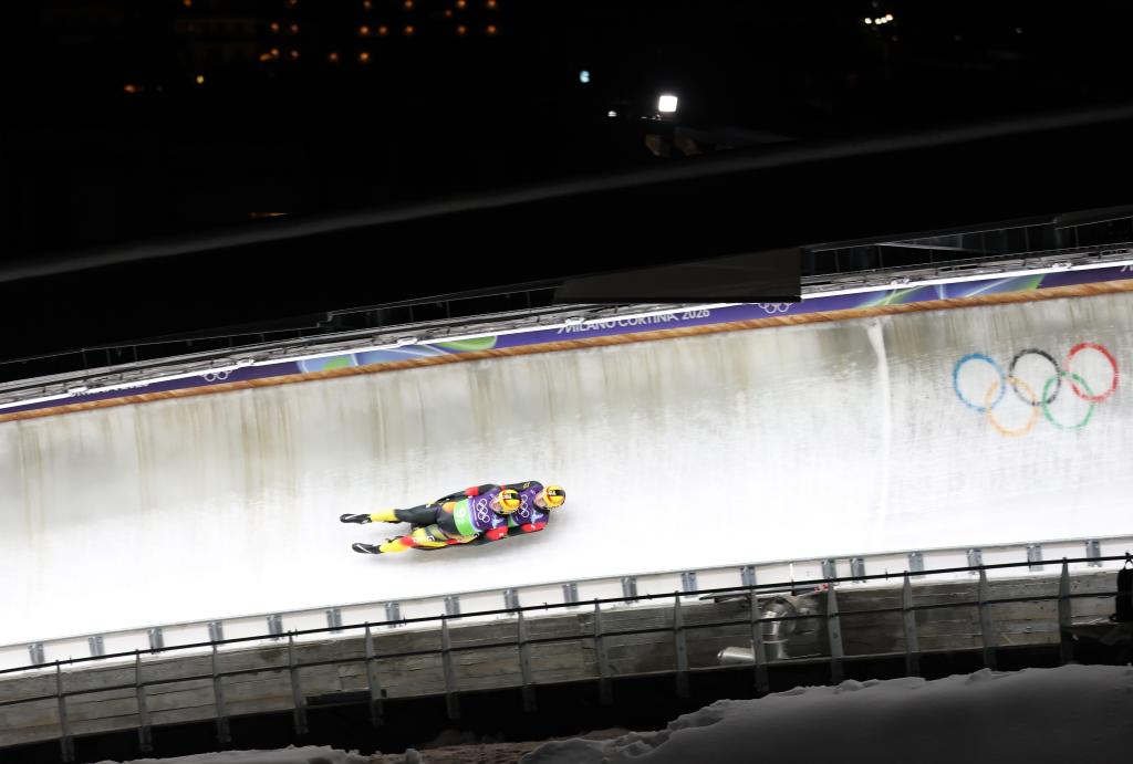 CORTINA D'AMPEZZO, 12 febrero, 2026 (Xinhua) -- Tobias Wendl/Tobias Arlt, de Alemania, compiten durante los relevos por equipos de luge en los Juegos Olímpicos de Invierno Milán-Cortina 2026, en Cortina, Italia, el 12 de febrero de 2026. (Xinhua/Ding Xu)