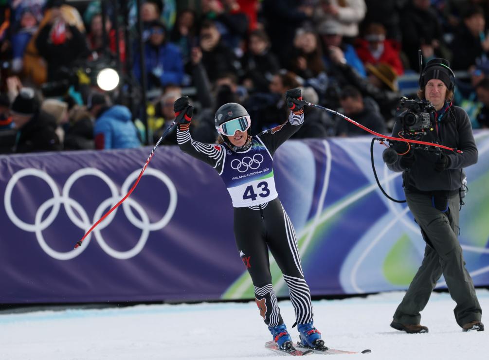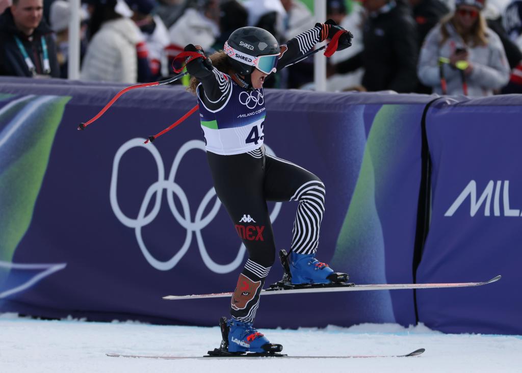 CORTINA D'AMPEZZO, 12 febrero, 2026 (Xinhua) -- Sarah Schleper, de México, festeja al término del super-G femenino de esquí alpino en los Juegos Olímpicos de Invierno Milán-Cortina 2026, en Cortina D'Ampezzo, Italia, el 12 de febrero de 2026. (Xinhua/Fei Maohua)