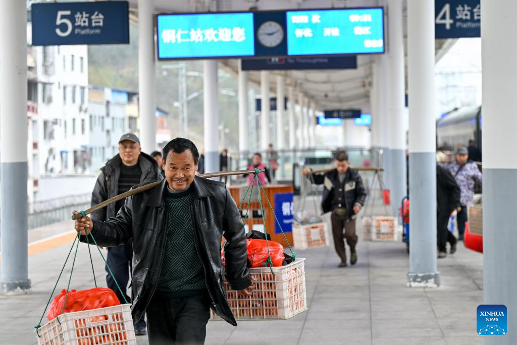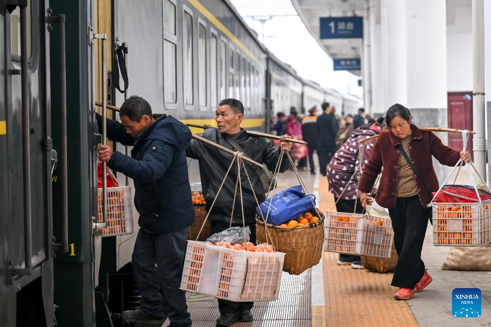 TONGREN, 13 febrero, 2026 (Xinhua) -- Imagen del 12 de febrero de 2026 de aldeanos de la provincia de Hunan cargando mercancía para su venta mientras se preparan para salir de la Estación del Ferrocarril de Tongren, en la ciudad de Tongren, en la provincia de Guizhou, en el suroeste de China. Los trenes número 7272/7271 han circulado a través de las áreas montañosas en Hunan, Guizhou y Chongqing por casi 20 años. Con una velocidad promedio de sólo 40 kilómetros por hora, el tren ha facilitado los viajes y desplazamientos de los residentes a lo largo de la ruta, al tiempo que ha ayudado a que los productos locales lleguen a mercados más amplios. (Xinhua/Long Jianrui)