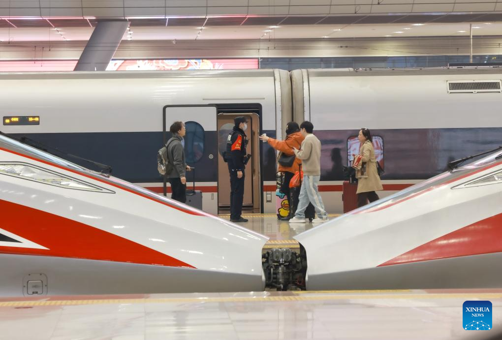 Pasajeros toman un tren en la Estación de Ferrocarril de Wuhan, en Wuhan, en la provincia de Hubei, en el centro de China, el 15 de febrero de 2026. Más de 285 millones de viajes de pasajeros interregionales están previstos en toda China el domingo, el primer día de las vacaciones de nueve días de la Fiesta de la Primavera de este año. La cifra representa un incremento de 10,5 por ciento respecto al mismo período del año pasado, indicó el domingo el Ministerio de Transporte. (Xinhua/Zhao Jun)