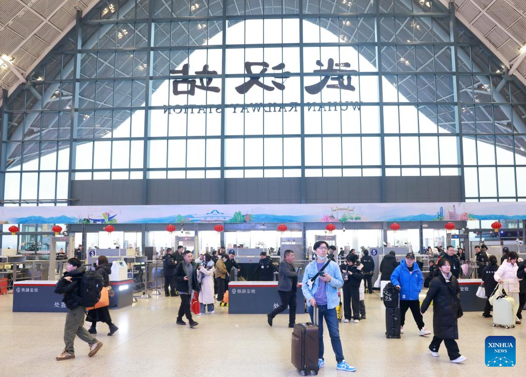 Pasajeros esperan por trenes en la Estación de Ferrocarril de Wuhan, en Wuhan, en la provincia de Hubei, en el centro de China, el 15 de febrero de 2026. Más de 285 millones de viajes de pasajeros interregionales están previstos en toda China el domingo, el primer día de las vacaciones de nueve días de la Fiesta de la Primavera de este año. La cifra representa un incremento de 10,5 por ciento respecto al mismo período del año pasado, indicó el domingo el Ministerio de Transporte. (Xinhua/Zhao Jun)