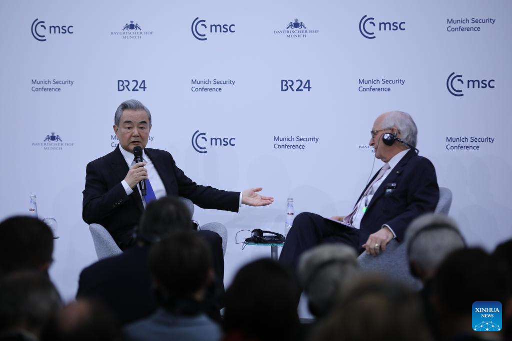 MUNICH, 14 febrero, 2026 (Xinhua) -- El ministro de Relaciones Exteriores chino, Wang Yi, también miembro del Buró Político del Comité Central del Partido Comunista de China, responde a preguntas después de pronunciar un discurso en la sesión "China en el Mundo" de la Conferencia de Seguridad de Múnich, en Múnich, Alemania, el 14 de febrero de 2026. (Xinhua/Du Zheyu)