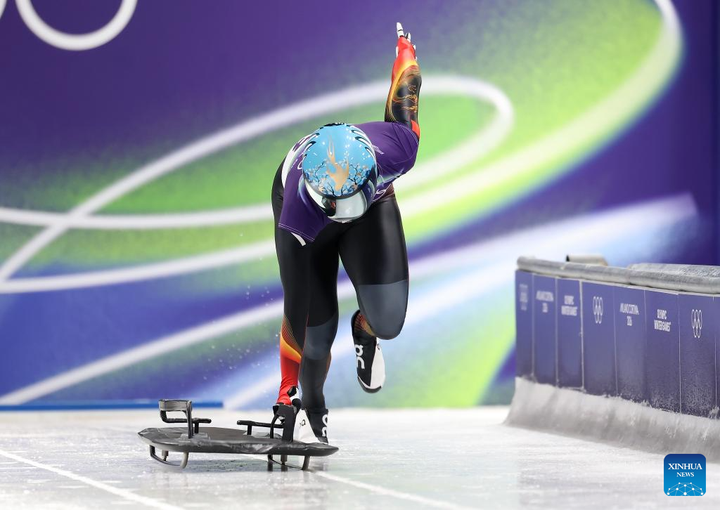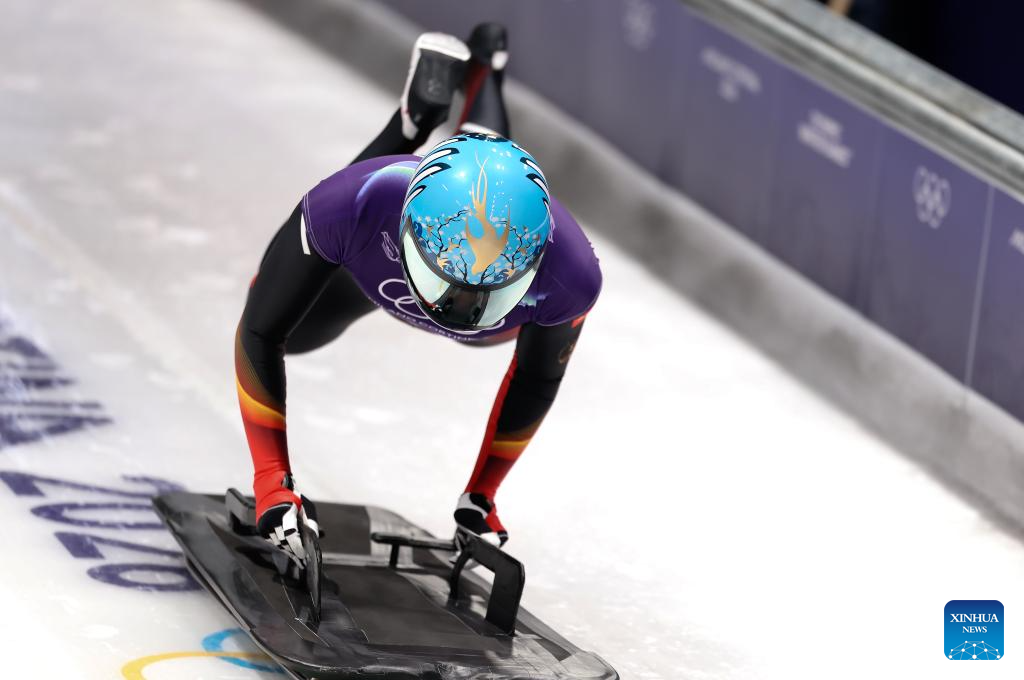 CORTINA D'AMPEZZO, 15 febrero, 2026 (Xinhua) -- Imagen del 14 de febrero de 2026 de Zhao Dan, de China, compitiendo durante la serie de skeleton femenino en los Juegos Olímpicos de Invierno Milán-Cortina 2026, en Cortina, Italia. (Xinhua/Ding Xu)