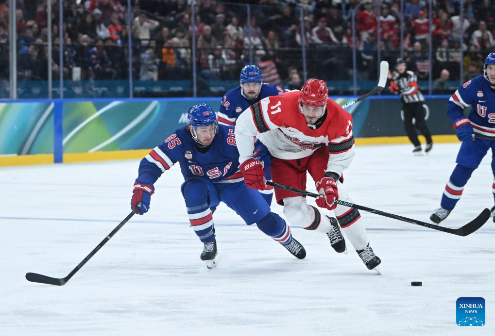 MILAN, 15 febrero, 2026 (Xinhua) -- Imagen del 14 de febrero de 2026 de jugadores compitiendo durante el partido del grupo C de la ronda preliminar masculina entre Estados Unidos y Dinamarca de hockey sobre hielo en los Juegos Olímpicos de Invierno Milán-Cortina 2026, en Milán, Italia. (Xinhua/Zhang Haofu)