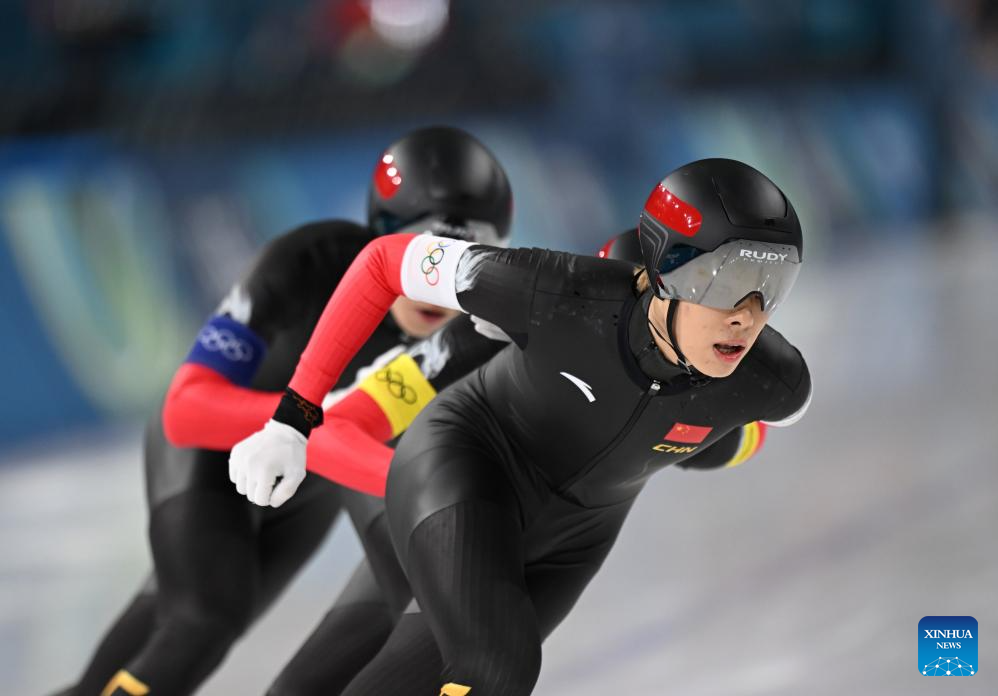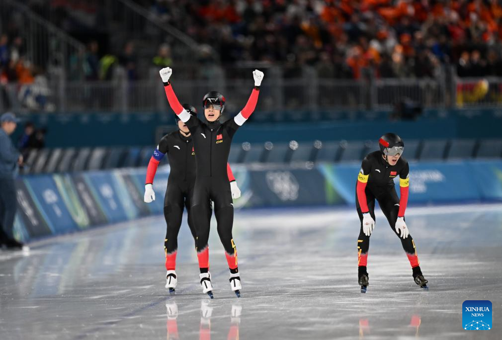 MILAN, 15 febrero, 2026 (Xinhua) -- (De izq. a der.) Liu Hanbin, Wu Yu, y Li Wenhao, de China, compiten durante los cuartos de final de persecución por equipos masculino de patinaje de velocidad en los Juegos Olímpicos de Invierno Milán-Cortina 2026, en Milán, Italia, el 15 de febrero de 2026. (Xinhua/Wu Wei)