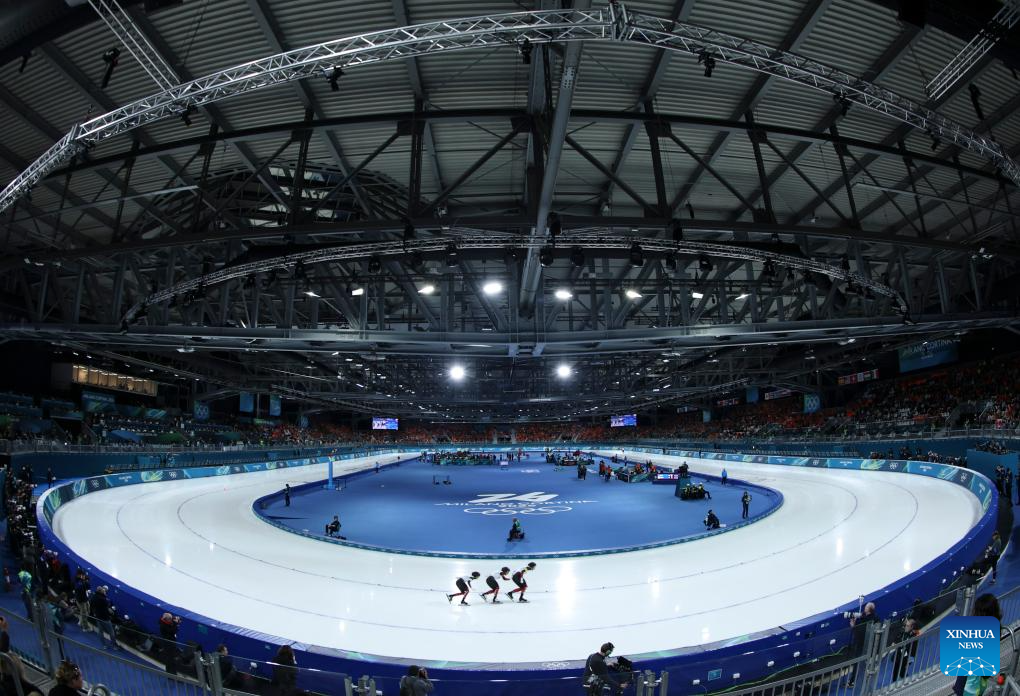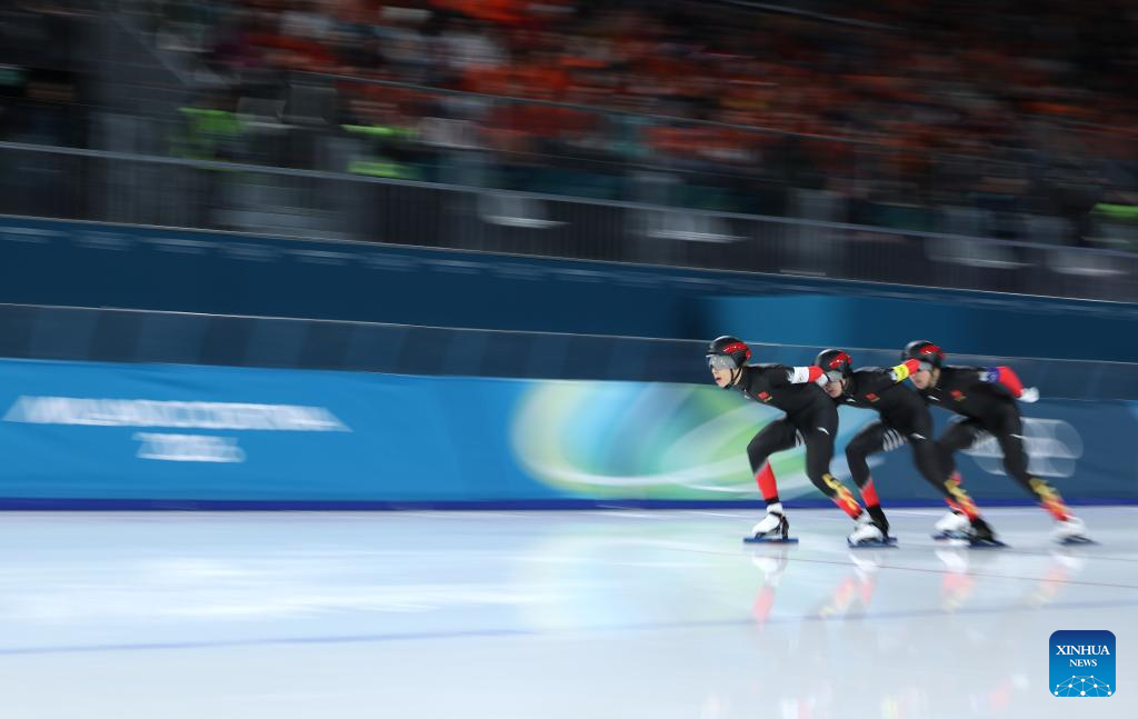MILAN, 15 febrero, 2026 (Xinhua) -- Imagen del 14 de febrero de 2026 del equipo de Países Bajos compitiendo durante los cuartos de final de persecución por equipos femenino de patinaje de velocidad en los Juegos Olímpicos de Invierno Milán-Cortina 2026, en Milán, Italia. (Xinhua/Li Jing)