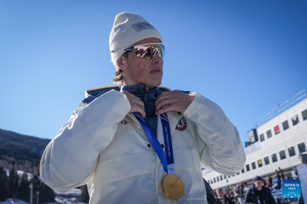 TESERO, 15 febrero, 2026 (Xinhua) -- Johannes Hoesflot Klaebo, de Noruega, muestra su medalla de oro durante la ceremonia de premiación del relevo 4x7,5 km masculino de esquí de fondo en los Juegos Olímpicos de Invierno Milán-Cortina 2026, en Tesero, Italia, el 15 de febrero de 2026. (Xinhua/Peng Ziyang)