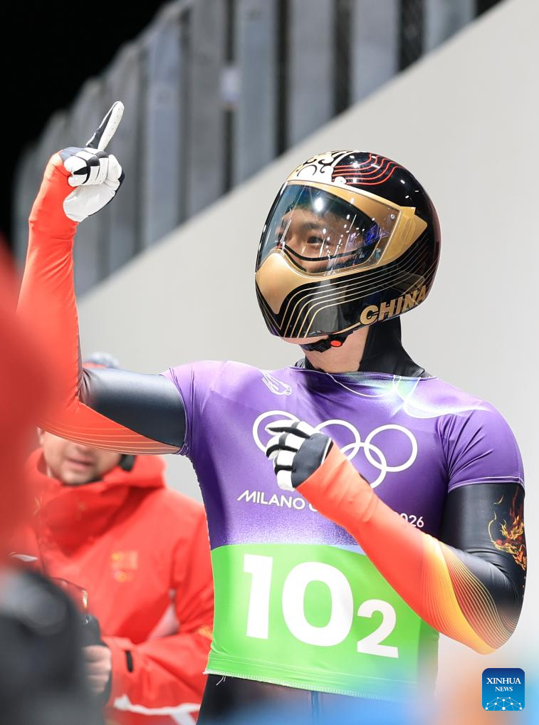 CORTINA D'AMPEZZO, 15 febrero, 2026 (Xinhua) -- Chen Wenhao, de China, festeja al término de la competencia por equipos mixtos de skeleton en los Juegos Olímpicos de Invierno Milán-Cortina 2026, en Cortina, Italia, el 15 de febrero de 2026. (Xinhua/Ding Xu)