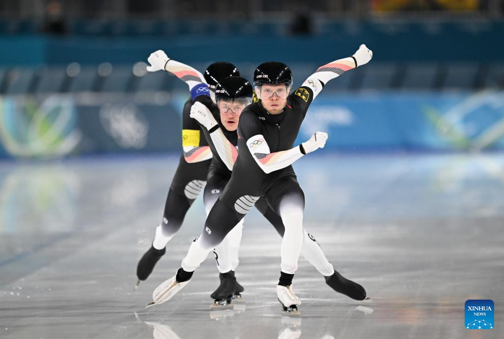 MILAN, 15 febrero, 2026 (Xinhua) -- Atletas de Alemania, compiten durante los cuartos de final de persecución por equipos masculino de patinaje de velocidad en los Juegos Olímpicos de Invierno Milán-Cortina 2026, en Milán, Italia, el 15 de febrero de 2026. (Xinhua/Wu Wei)