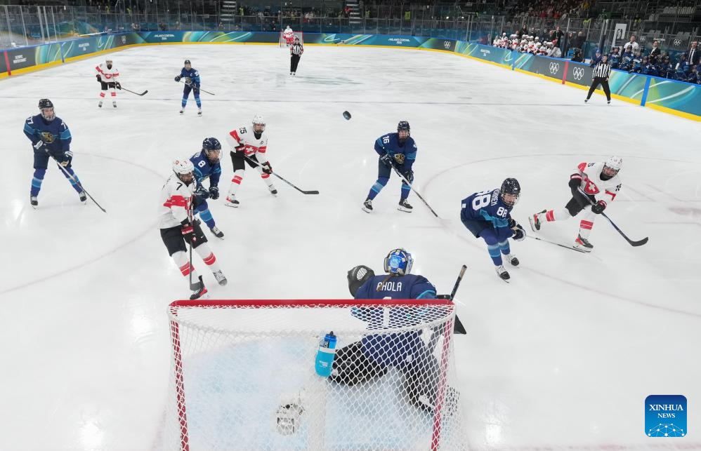 MILAN, 15 febrero, 2026 (Xinhua) -- Imagen del 14 de febrero de 2026 de Laure Meriguet (d), de Suiza, disparando durante el partido de cuartos de final de las eliminatorias femeninas de hockey sobre hielo en los Juegos Olímpicos de Invierno Milán-Cortina 2026, en Milán, Italia. (Xinhua/Wang Kaiyan/Pool)