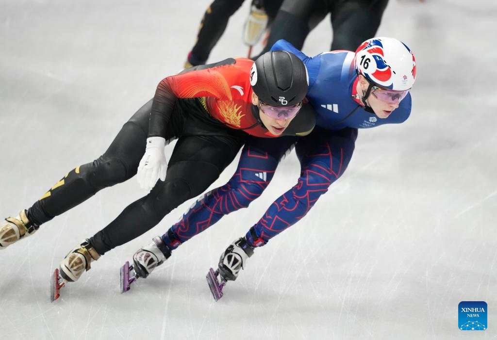 MILAN, 15 febrero, 2026 (Xinhua) -- Imagen del 14 de febrero de 2026 de Liu Shaoang (i), de China, y Niall Treacy, de Reino Unido, compitiendo durante la final A de los 1500 m masculinos de patinaje de velocidad en pista corta en los Juegos Olímpicos de Invierno Milán-Cortina 2026, en Milán, Italia. (Xinhua/Xue Yuge)