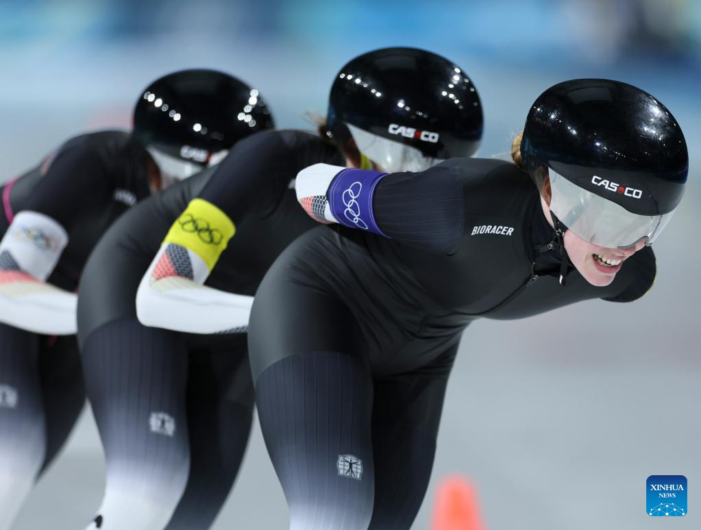 MILAN, 15 febrero, 2026 (Xinhua) -- Imagen del 14 de febrero de 2026 del equipo de Alemania compitiendo durante los cuartos de final de persecución por equipos femenino de patinaje de velocidad en los Juegos Olímpicos de Invierno Milán-Cortina 2026, en Milán, Italia. (Xinhua/Li Jing)