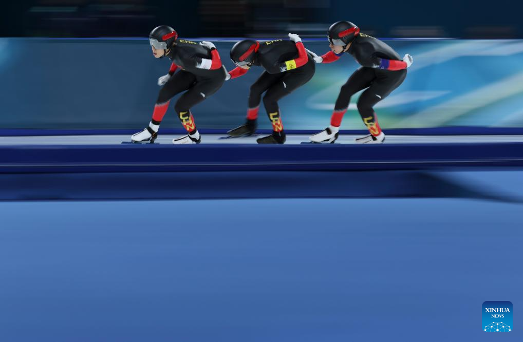 MILAN, 15 febrero, 2026 (Xinhua) -- (De izq. a der.) Liu Hanbin, Wu Yu, y Li Wenhao, de China, compiten durante los cuartos de final de persecución por equipos masculino de patinaje de velocidad en los Juegos Olímpicos de Invierno Milán-Cortina 2026, en Milán, Italia, el 15 de febrero de 2026. (Xinhua/Li Jing)