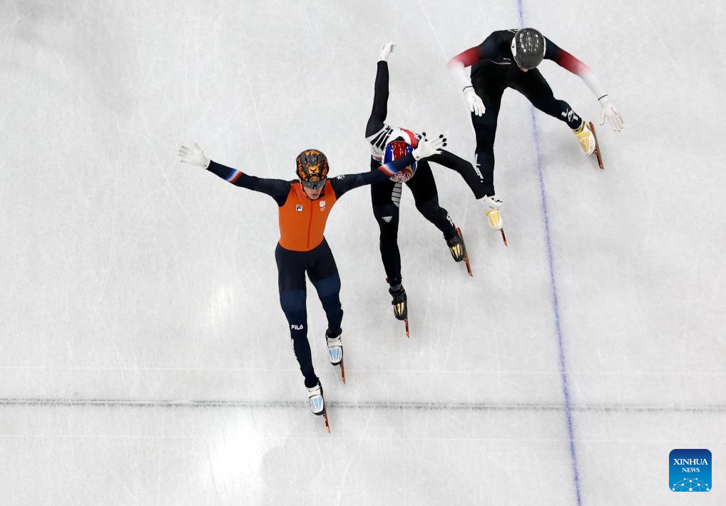 MILAN, 15 febrero, 2026 (Xinhua) -- Imagen del 14 de febrero de 2026 de Jens van 'T Wout (i), de Países Bajos, festejando tras cruzar la línea de meta durante la final A de los 1500 m masculinos de patinaje de velocidad en pista corta en los Juegos Olímpicos de Invierno Milán-Cortina 2026, en Milán, Italia. (Xinhua/Cheng Min)