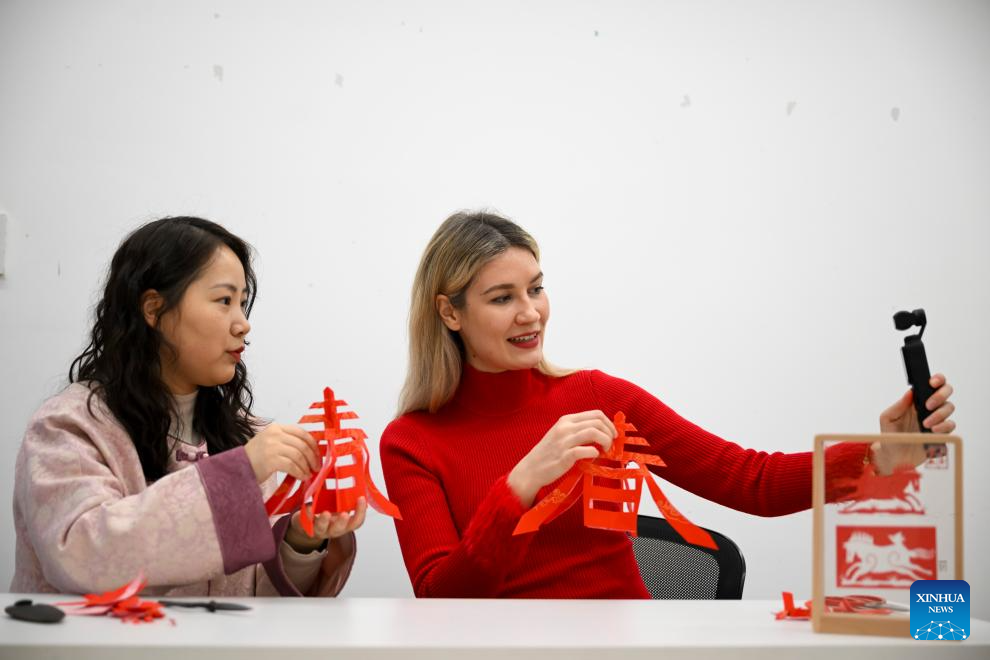 SHANGHAI, 16 febrero, 2026 (Xinhua) -- Imagen del 6 de febrero de 2026 de Aleksandra Antonenko (d), grabando videos cortos sobre la experiencia del corte de papel, en Shanghai, en el este de China. Aleksandra Antonenko se mudó de Rusia para realizar su doctorado en la Universidad Jiao Tong de Shanghai en 2022. También comenzó a mostrar el encanto de la vida cotidiana en China al mundo con videos cortos. (Xinhua/Chen Haoming)