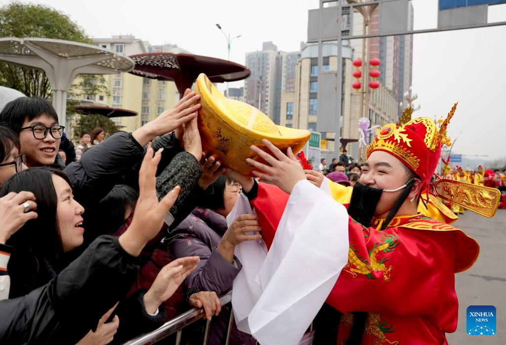 BEIJING, 17 febrero, 2026 (Xinhua) -- Un hombre vestido como el Dios de la Fortuna interactúa con los visitantes, en la ciudad de Huaying, en la provincia de Sichuan, en el suroeste de China, el 17 de febrero de 2026. La Fiesta de la Primavera de este año registró un aumento de visitantes deseosos de experimentar la gastronomía local, la rica historia y vibrantes presentaciones folclóricas. (Xinhua/Zhou Songlin)