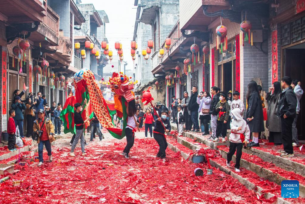 BEIJING, 17 febrero, 2026 (Xinhua) -- Personas realizan la danza del dragón en celebración de la Fiesta de la Primavera, en Jingxi, en la región autónoma de la etnia zhuang de Guangxi, en el sur de China, el 17 de febrero de 2026. La Fiesta de la Primavera de este año registró un aumento de visitantes deseosos de experimentar la gastronomía local, la rica historia y vibrantes presentaciones folclóricas. (Xinhua/Zhao Jingwu)