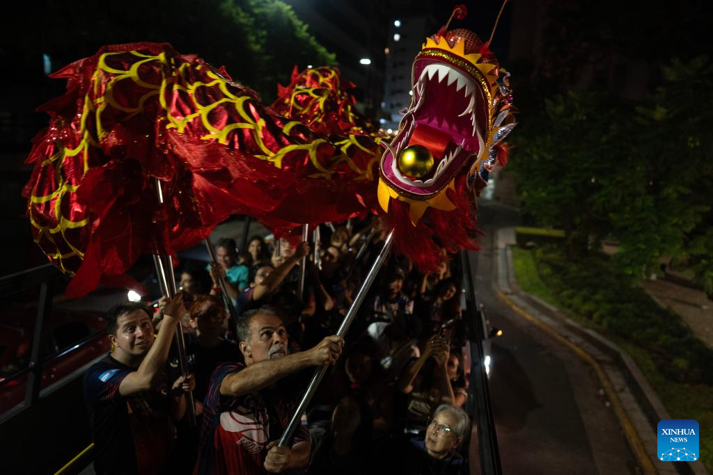 BUENOS AIRES, 17 febrero, 2026 (Xinhua) -- Imagen del 16 de febrero de 2026 de artistas marciales de la escuela Lung Chuan realizando la danza del dragón durante un recorrido en un autobús turístico por monumentos iluminados de rojo durante las celebraciones por el Año Nuevo chino, en la ciudad de Buenos Aires, capital de Argentina. La ciudad de Buenos Aires, capital de Argentina, se engalanó de rojo la noche del lunes para festejar la llegada del Año Nuevo chino iluminando monumentos, edificios y paseos emblemáticos a lo largo de diferentes barrios porteños. (Xinhua/Martín Zabala)