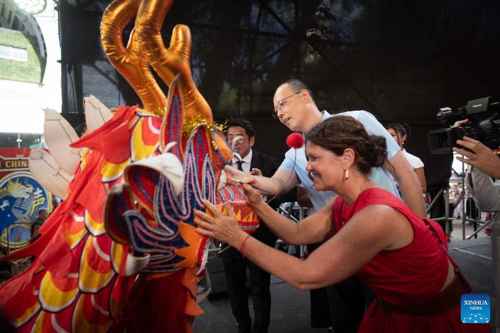 BUENOS AIRES, 17 febrero, 2026 (Xinhua) -- Imagen del 16 de febrero de 2026 del consejero de la Embajada de China en Argentina Ren Qiang (2-d), y Gabriela Ricardes (d), ministra de cultura de la ciudad de Buenos Aires, realizando el tradicional clavado de pupilas al dragón, durante las celebraciones por el Año Nuevo chino, en el Barrio Chino, en la ciudad de Buenos Aires, capital de Argentina. El Barrio Chino de Buenos Aires celebró el lunes la llegada del Año Nuevo chino o Fiesta de la Primavera con un multitudinario evento lleno de color y emoción que ofreció arte, cultura, música, moda, baile y gastronomía de China. (Xinhua/Martín Zabala)