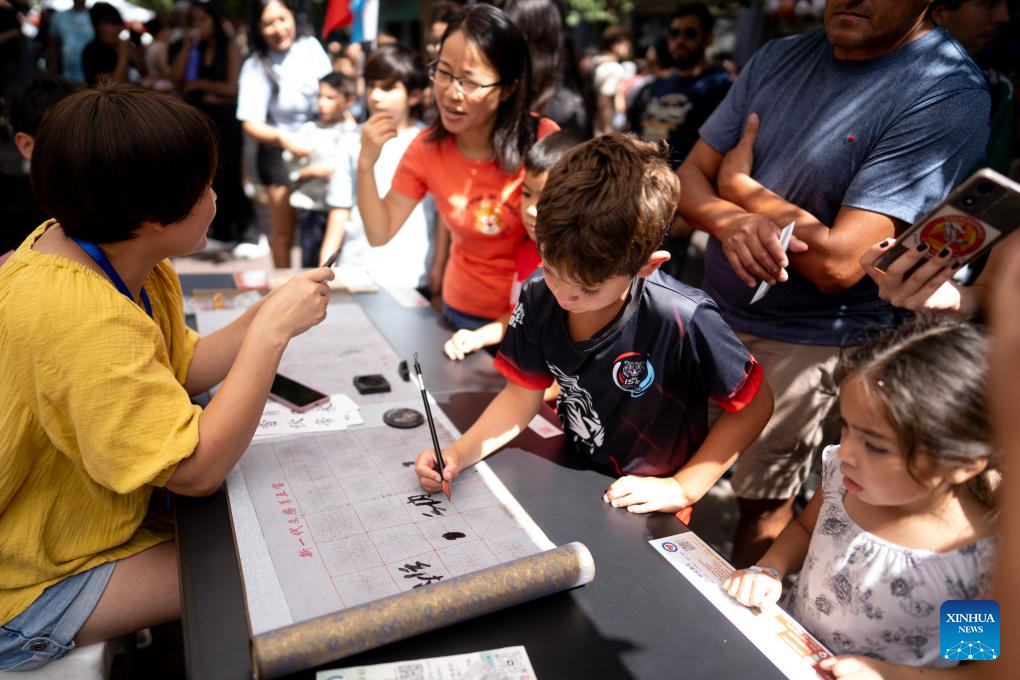 BUENOS AIRES, 17 febrero, 2026 (Xinhua) -- Imagen del 16 de febrero de 2026 de Juan (3-d), de 9 años de edad, practicando caligrafía china en un estand durante las celebraciones por el Año Nuevo chino, en el Barrio Chino, en la ciudad de Buenos Aires, capital de Argentina. El Barrio Chino de Buenos Aires celebró el lunes la llegada del Año Nuevo chino o Fiesta de la Primavera con un multitudinario evento lleno de color y emoción que ofreció arte, cultura, música, moda, baile y gastronomía de China. (Xinhua/Martín Zabala)